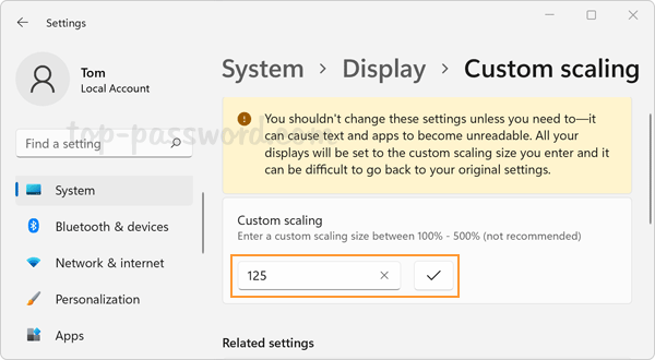 - 在“”中輸入 100 到 500 之間的比例因子自定義縮放”字段,然後單擊右側的勾選按鈕以保存更改。