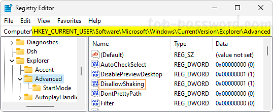 HKEY_CURRENT_USER\Software\Microsoft\Windows\CurrentVersion\Explorer\Advanced。查找 DWORD禁止搖晃,然後雙擊它進行修改。