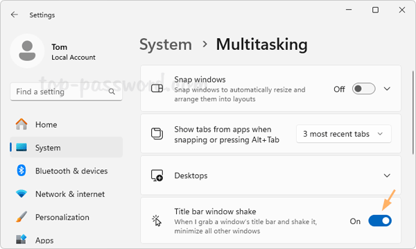 - 切換開關“標題欄窗口抖動” 到在位置以啟用標題欄窗口抖動,或將其切換為離開如果你想禁用 Aero Shake。