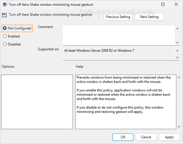 - 將“關閉 Aero Shake 窗口最小化鼠標手勢”策略設置為未配置。