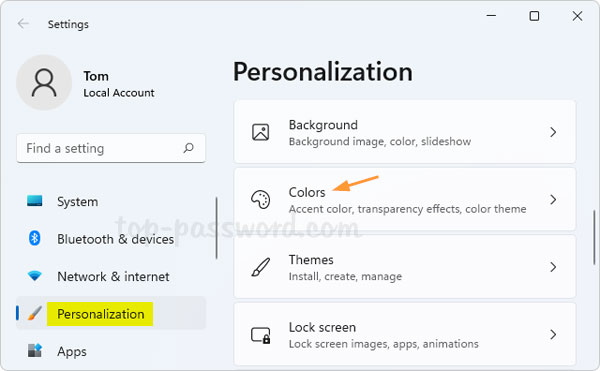 - 按Windows鍵 + i在一起啟動設置應用程序。選擇“個性化”左側欄的標籤,然後單擊顏色在右窗格上。