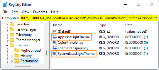 - 要完全打開黑暗模式,只需更改兩者的價值數據appsuselighttheme和SystemuseslightTheme到1。