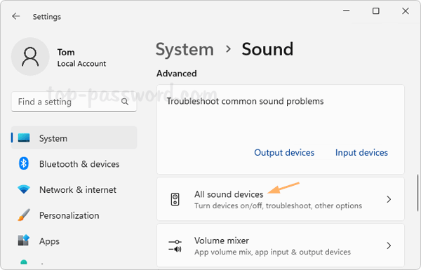 - “設置”應用程序將啟動並打開“聲音”頁面。單擊“所有聲音設備”高級部分下的選項。