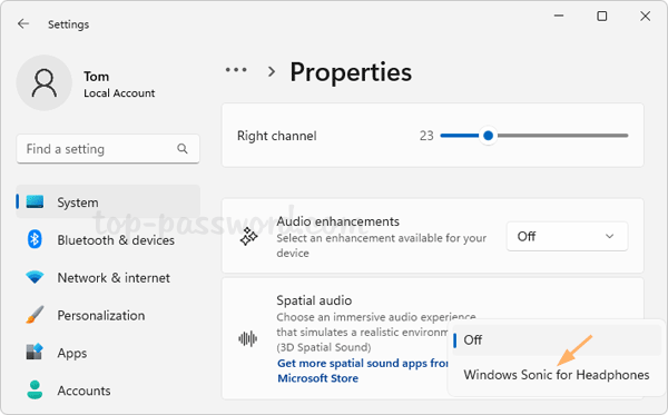 - 選擇空間音效選項卡。單擊“空間聲音格式”部分,您可以選擇適用於耳機的 Windows Sonic打開空間音效,或將其設置為離開如果你想禁用空間聲音。