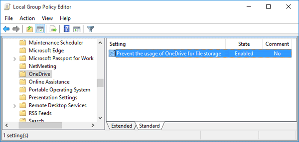 Computer Configuration -> Administrative Templates -> Windows Components -> OneDrive - 在右窗格中,雙擊策略名稱防止使用OneDrive用於文件存儲並將其設置為啟用。