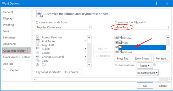 - 當“Word 選項”對話框打開時,選擇自定義功能區選項卡。選擇主要選項卡從自定義功能區下拉框。檢查開發商列表中的選項。點擊好的。