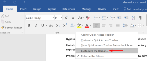 - 在家Microsoft Word 選項卡,右鍵單擊功能區上的空白位置,然後選擇自定義功能區。