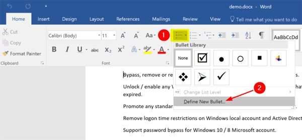 - 選擇 Word 文檔中的列表。在家Microsoft Word 選項卡的段落部分,單擊旁邊的小向下箭頭子彈按鈕。