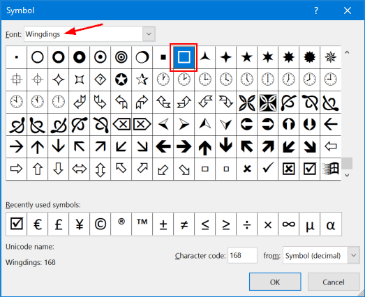 - 打開符號窗口時,選擇翅膀從字體下拉式選單.接下來,您可以選擇已選中或未選中的複選框,並將其插入到 Word 文檔中。