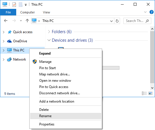 如果您已將 Windows 10 配置為在桌面上顯示“此電腦”,則可以直接從桌面重命名它。只需右鍵單擊“此電腦”圖標並選擇“重命名從下拉上下文菜單中輸入“我的電腦”,然後鍵入新名稱“我的電腦”並按 Enter 鍵。