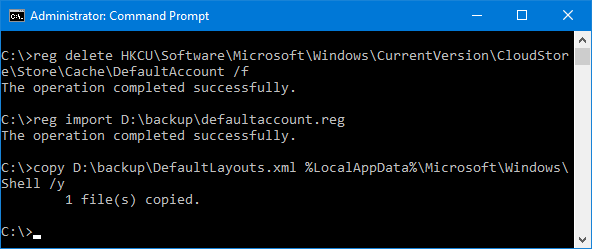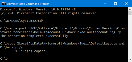 reg export HKCU\Software\Microsoft\Windows\CurrentVersion\CloudStore\Store\Cache\DefaultAccount D:\backup\defaultaccount.reg /y