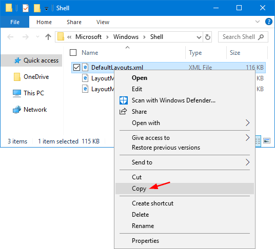 - 現在,右鍵單擊默認佈局.xml文件並選擇複製。將其粘貼到文件夾 %LocalAppData%\Microsoft\Windows\Shell。