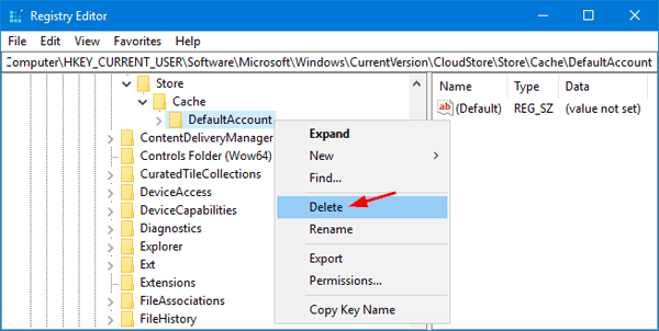 reg delete HKCU\Software\Microsoft\Windows\CurrentVersion\CloudStore\Store\Cache\DefaultAccount /f