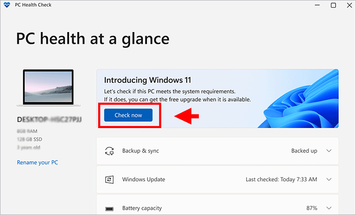步驟4:PC Health Check應用程序立即運行。您可以單擊右上方菜單頂部的“立即檢查”按鈕,以檢查該PC是否滿足系統需求。