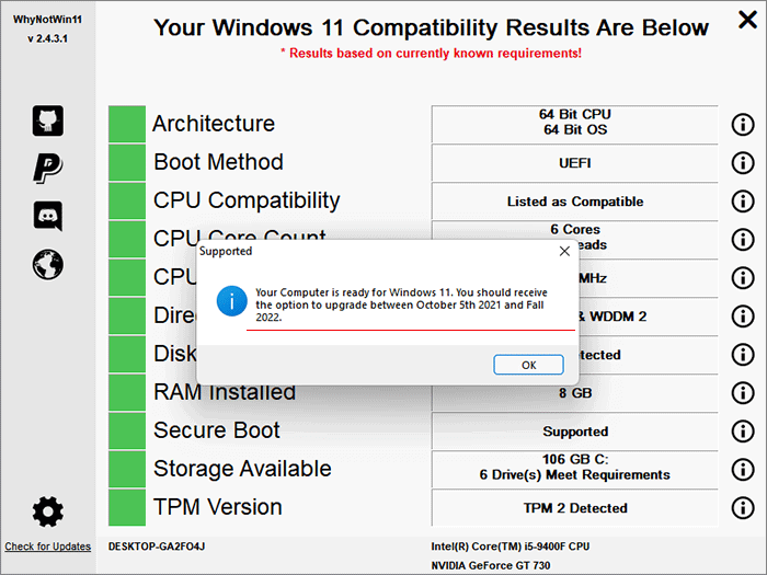 步驟3:然後,此應用程序將自動運行,以檢查您的PC是否符合Windows 11系統需求。如果您的計算機已經準備好用於Windows 11,則將獲得受支持的彈出窗口。