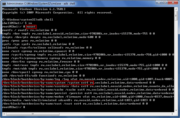 1. 輸入“mount”並按 Enter 鍵檢查 /system 文件夾權限,並獲取 /system 分區位置。