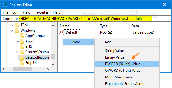 打開註冊表編輯器並導航至:HKEY_LOCAL_MACHINE\SOFTWARE\Policies\Microsoft\Windows\DataCollection。在右側窗格中,右鍵單擊空白區域並選擇新的->DWORD(32 位)值。