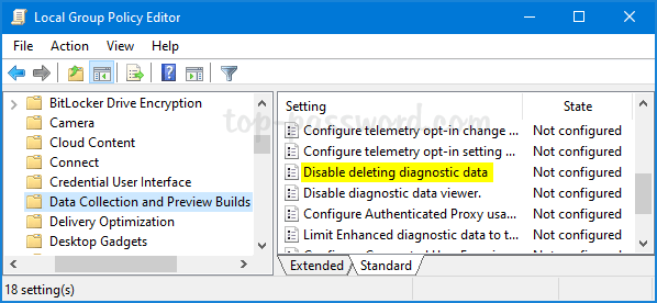 打開本地組策略編輯器並瀏覽到:Computer Configuration -> Administrative Templates -> Windows Components -> Data Collection and Preview Builds。接下來,雙擊“禁用刪除診斷數據” 右側窗格中的策略。