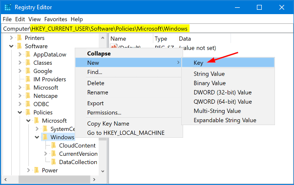 HKEY_CURRENT_USER\Software\Policies\Microsoft\Windows右鍵單擊視窗鍵入左側窗格中的 ,然後選擇新的->鑰匙並命名它探險家。