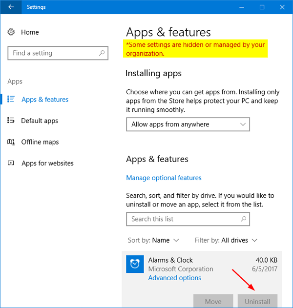 - 重新啟動計算機以使策略生效。當您右鍵單擊“開始”菜單中的應用程序時,您現在不應找到卸載選項。如果你深入挖掘設定->應用程序和功能,然後選擇任何應用程序,您將看到“解除安裝”選項也呈灰色。