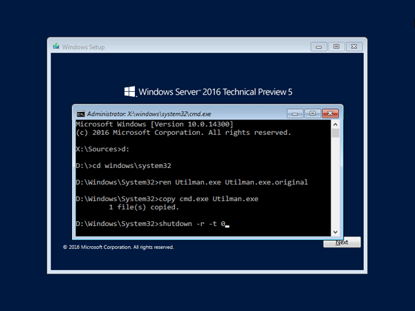 - 從 Windows Server 2016 安裝 DVD 引導服務器。當出現設置屏幕時,按SHIFT + F10鍵打開命令提示符。