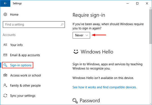 - 點擊登錄選項在左側,然後選擇絕不對於“需要登錄如果您想阻止 Windows 10 從睡眠狀態喚醒後詢問密碼,請選擇“選項”。