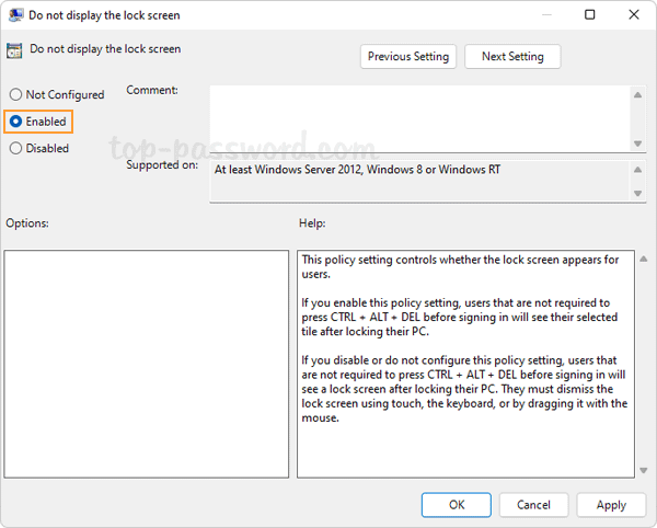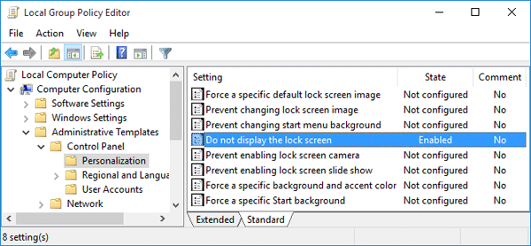 Computer Configuration -> Administrative Templates -> Control Panel -> Personalization。在右側窗格中,找到並雙擊“不顯示鎖屏“ 政策。