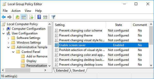 - 導航到用戶配置 > 管理模板 > 控制面板 > 個性化。雙擊標有“啟用屏幕保護程序”。