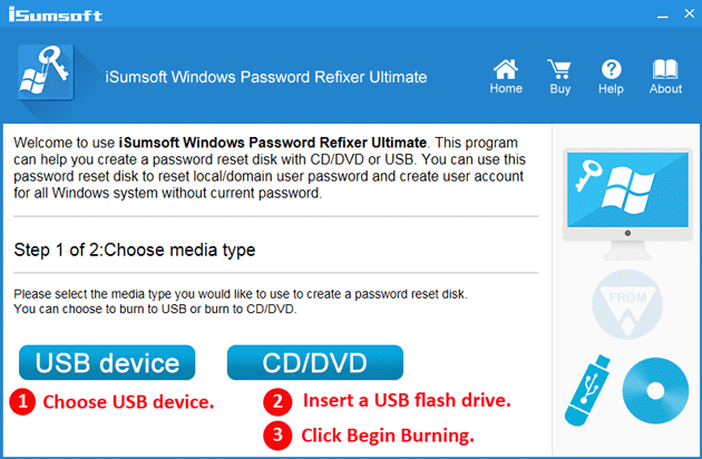 在任何計算機上下載並安裝 Windows 密碼修復工具。由於您現在無法使用自己的 HP Windows 10 筆記本電腦,因此您必須在另一台計算機上執行下載和安裝。在該計算機上安裝 Windows Password Refixer 後,啟動它,然後按照屏幕上的說明將該程序刻錄到可移動介質中,例如 USB 設備或 CD/DVD 閃存驅動器。刻錄成功後,將創建密碼重設盤。