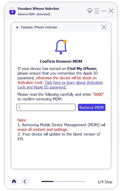 步驟3:輸入 0000 並單擊“刪除 MDM”以開始從 iOS 或 iPad OS 設備中刪除 MDM 錯誤。然後,您可以斷開手機連接並開始使用它,而無需 MDM 鎖定。