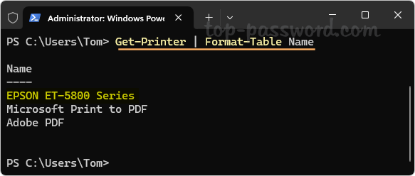 Get-Printer | Format-Table Name並按 Enter 鍵查看所有可用打印機的名稱。