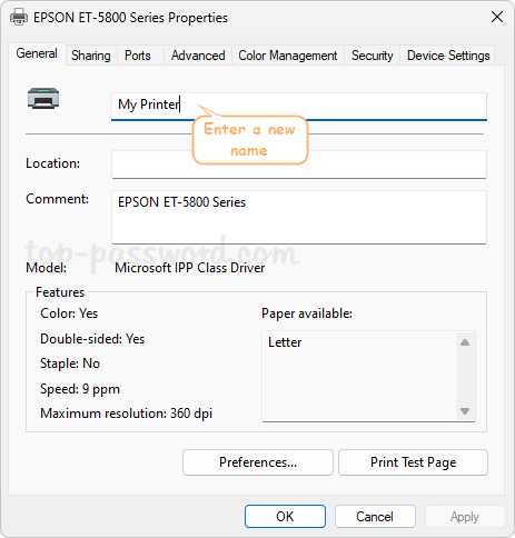 - 現在您可以將打印機的名稱更改為您喜歡的任何名稱。點擊好的保存您的更改。
