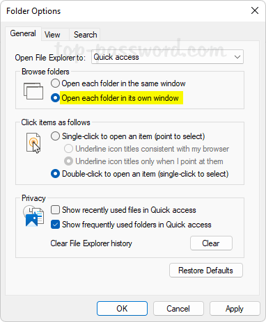 在“常規”選項卡中,選擇“在自己的窗口中打開每個文件夾“。 點擊好的。