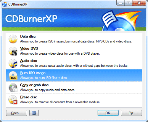 - 首次啟動CDBurnerXP時,您可以從開始屏幕中選擇一個操作列表。要製作現場CD,請拿起燃燒ISO圖像選項並單擊好的。