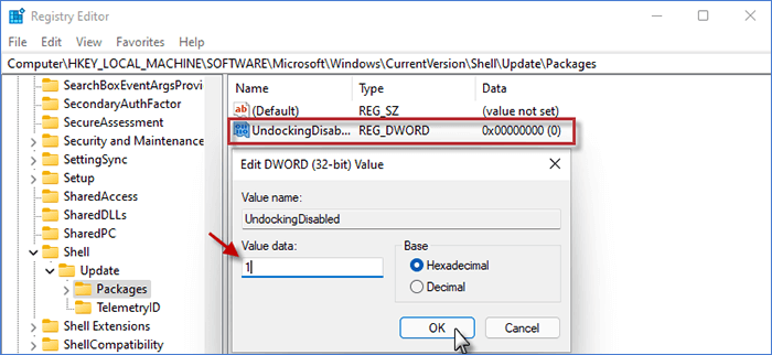 步驟 3:將新值命名為取消對接禁用 並雙擊它以將值數據更改為1.