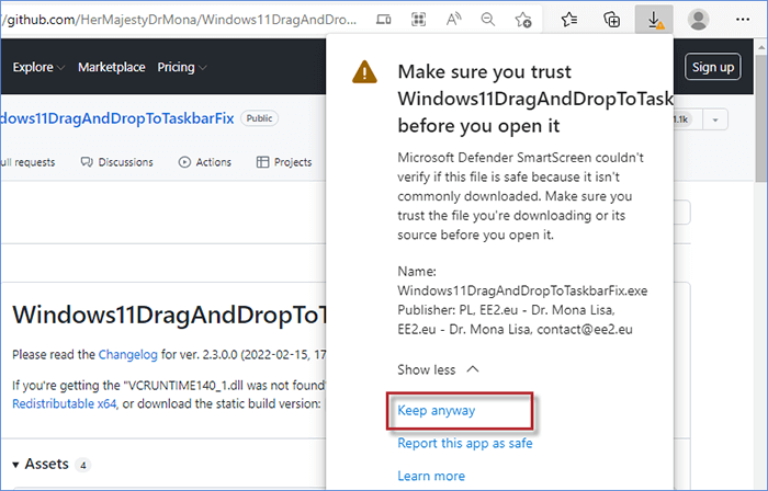 第 3 步:點擊顯示更多在警告中,您可以選擇無論如何都要保留。然後 Windows11DragAndDropToTaskbarFix 文件可以被信任並下載到您的電腦上。
