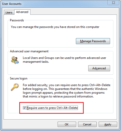 - 取消選中要求用戶按 Ctrl+Alt+Delete複選框。單擊“確定”。下次啟動計算機時,它將直接啟動到登錄憑據對話框,而不會提示您按 Ctrl+Alt+Del。