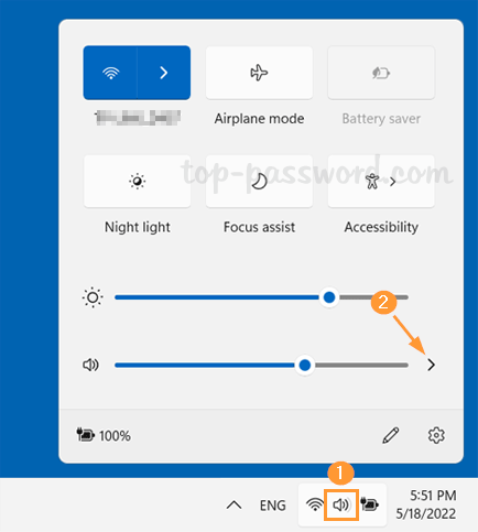 單擊揚聲器系統托盤(屏幕右下角)中的 圖標可打開“快速設置”面板。接下來,單擊音量滑塊右上角的小箭頭圖標。