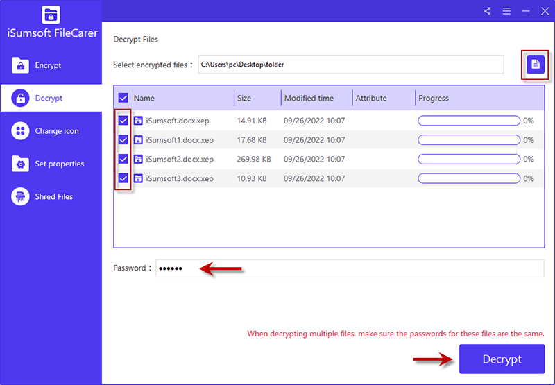 步驟 2:要選擇要使用密碼保護的文檔文件,請單擊文件夾圖標並且您可以選擇多個文檔。