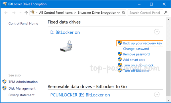 - 單擊標有“備份您的恢復密鑰” 位於加密驅動器旁邊。