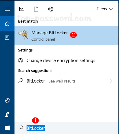 - 要開始,請輸入比特鎖在任務欄上的 Cortana 搜索框中,然後單擊管理 BitLocker從結果中打開 BitLocker 驅動器加密控制面板。