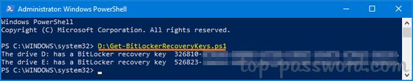 屏幕將顯示計算機上找到的每個 BitLocker 驅動器的恢復密鑰。如果您被限制運行 PowerShell 腳本,則可能需要調整 PowerShell 執行策略。