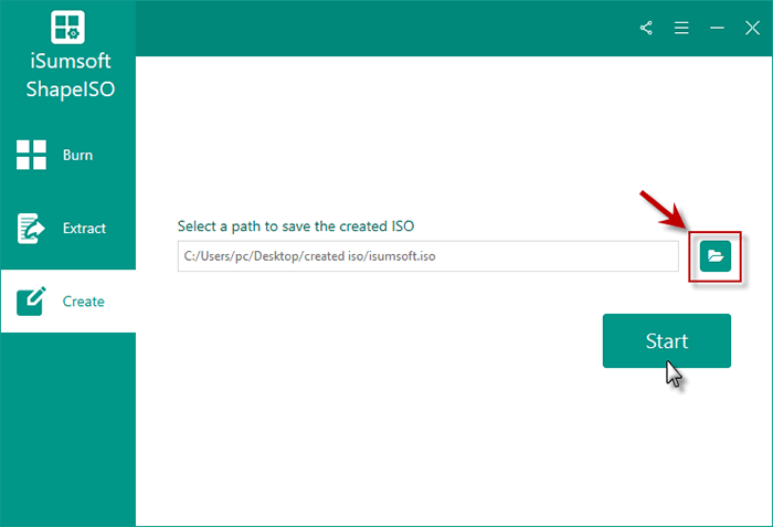 單擊文件圖標選擇要保存創建的 ISO 文件的位置,然後單擊開始。