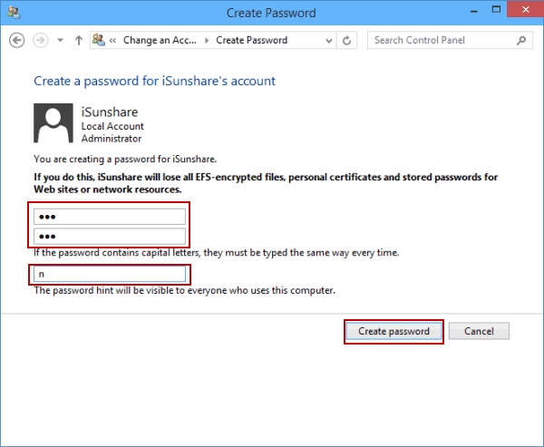 步驟5:輸入新密碼,重新輸入,輸入密碼提示,然後單擊創建密碼。