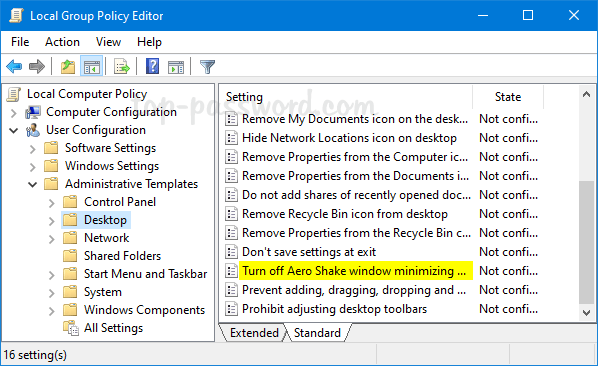 User Configuration > Administrative Templates > Desktop。在右側,雙擊“關閉 Aero Shake 窗口以最小化鼠標手勢“ 政策。