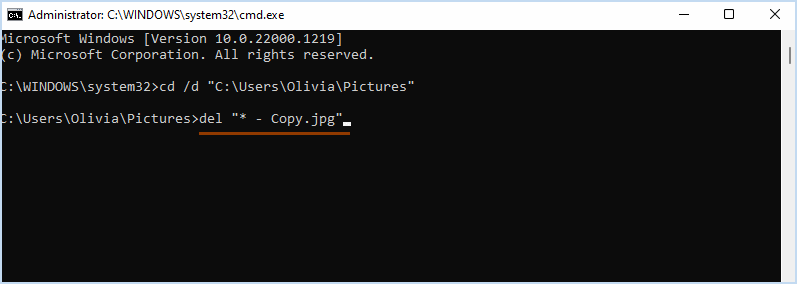 第 4 步:輸入下一個命令並點擊進入。這裡需要更換-複製.jpg帶有您掃描的文件的相應後綴和擴展名。例如,如果您想刪除。後綴為1的png文件,需要輸入刪除“* – 1.png”