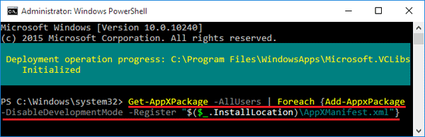 Get-AppXPackage -AllUsers | Foreach {Add-AppxPackage -DisableDevelopmentMode -Register "$($_.InstallLocation)\AppXManifest.xml"}