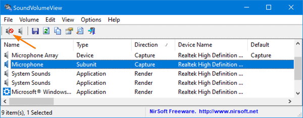 有一個便攜式免費軟件叫做聲音音量視圖它允許您從命令提示符和 GUI 靜音或取消靜音任何聲音設備。下載 SoundVolumeView 後,將其解壓縮並啟動 .exe 文件。它將列出您計算機上可用的所有聲音設備。要將麥克風靜音,只需選擇麥克風設備並單擊工具欄中的靜音圖標即可。