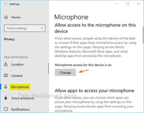 選擇麥克風在左側。在右側,單擊改變“允許訪問此設備上的麥克風”下的按鈕。