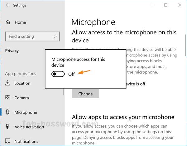 在彈出窗口中,將設置切換為離開。這將禁用 Windows 10 中對麥克風的訪問。
